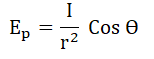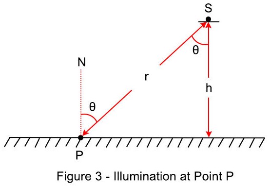 案例III – 考虑平面表面上的点'P',光源(S)与点'P'之间的距离为'r'米。光源(S)位于表面上方'h'米高,发光强度为'I'坎德拉,如下图所示。