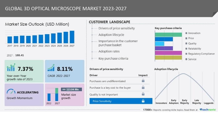 Technavio是一家领先的市场研究公司,发布了一份关于“3D光学显微镜市场分析:北美、欧洲、亚洲及其他地区(ROW) - 美国、英国、德国、加拿大、中国 - 2024-2028年规模与预测”的报告。根据该报告,3D光学显微镜市场的规模预计将在2024至2028年间增长1.306亿美元,年均增长率为8.64%。