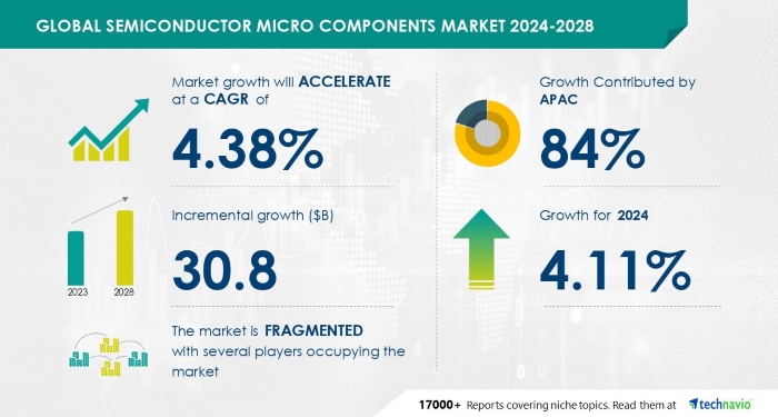 Technavio是一家全球知名的市场研究公司,发布了一份关于半导体微型元件市场分析:亚太地区、北美、欧洲、南美、中东和非洲 - 中国、台湾、美国、韩国、日本 - 2024-2028年规模与预测的报告。根据报告,半导体微型元件市场的规模预计将在2023年至2028年间以4.38%的复合年增长率增长,增加300亿美元。