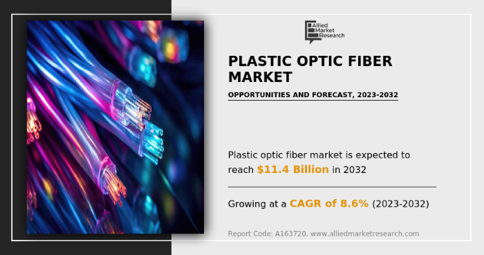 Allied Market Research,一家全球市场研究和商业咨询公司,发布了一份关于“塑料光纤市场规模、份额、竞争格局及趋势分析报告,按电缆类型和终端行业分类:全球机会分析及行业预测,2023-2032”的报告。根据该报告,全球塑料光纤市场在2022年的估值为50亿美元,预计到2032年将达到114亿美元,年均增长率为8.6%。